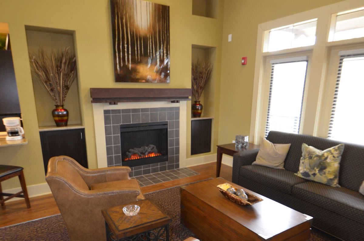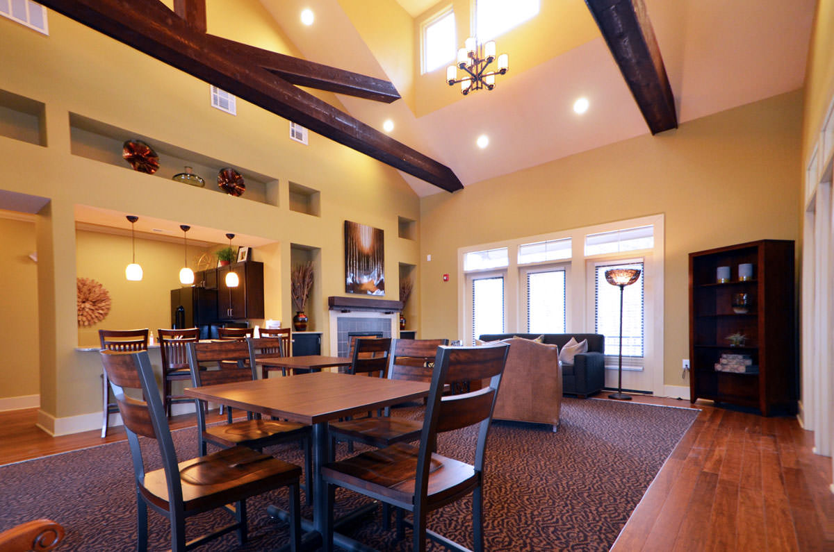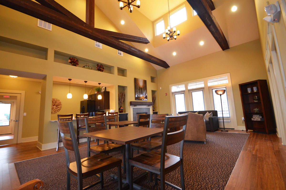 Residents were impressed with the modern craftsman community center and leasing area with exposed timber frames and soaring ceiling. The striking natural finishes match the lush wooded grounds, creating a warm and inviting space complete with fireplace.