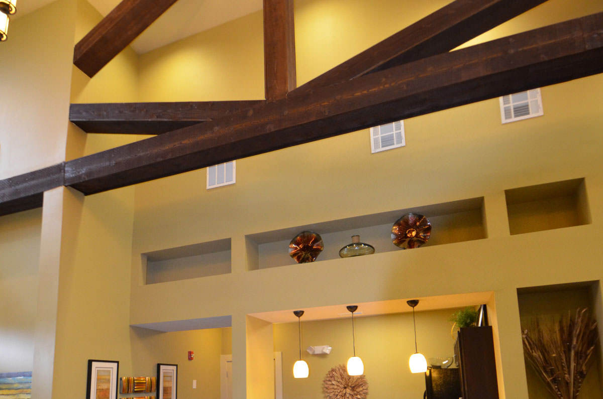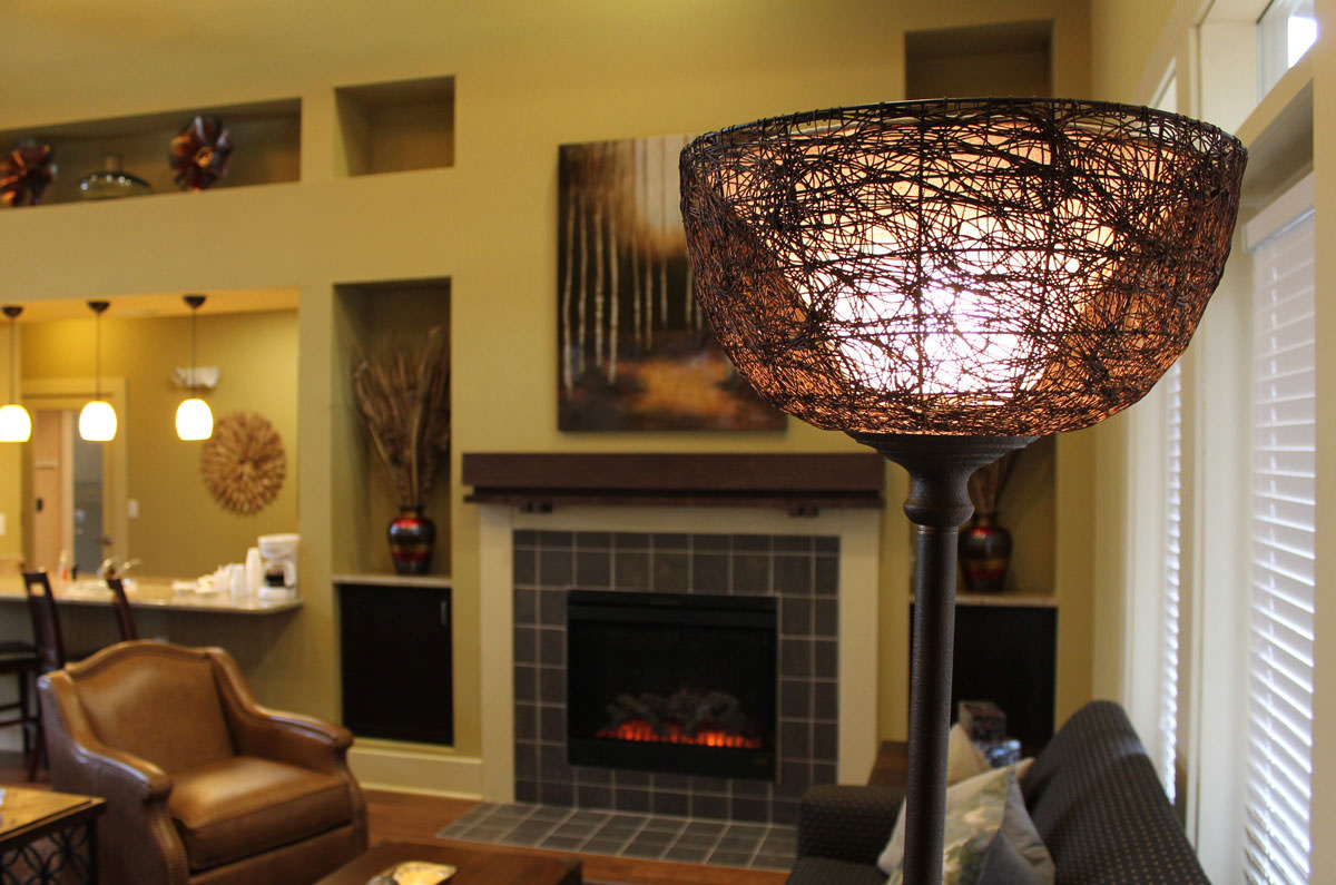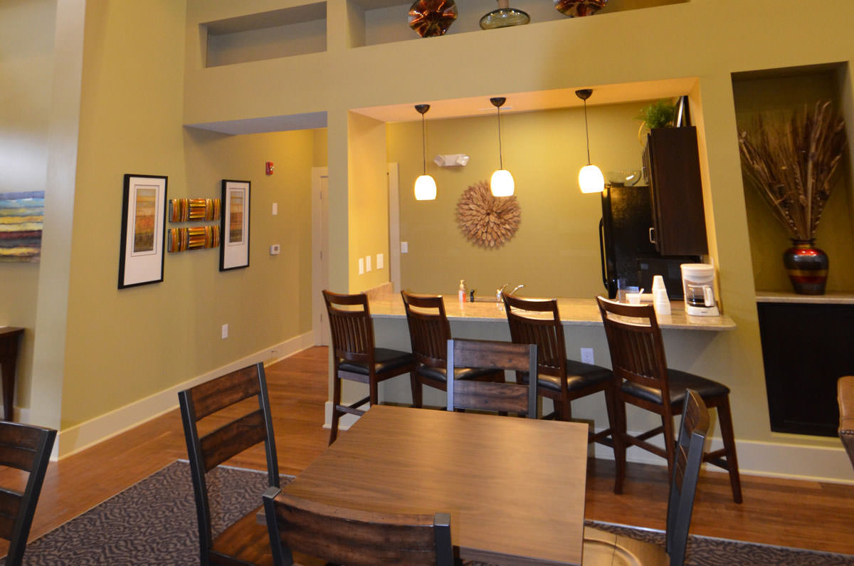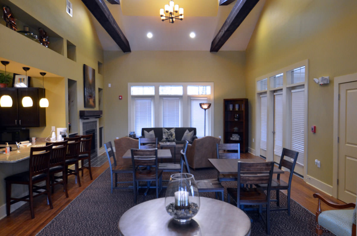 Residents were impressed with the modern craftsman community center and leasing area with exposed timber frames and soaring ceiling. The striking natural finishes match the lush wooded grounds, creating a warm and inviting space complete with fireplace.