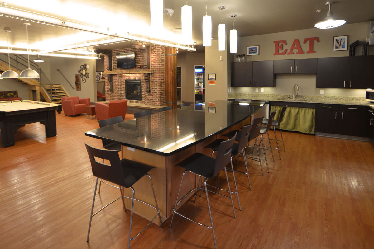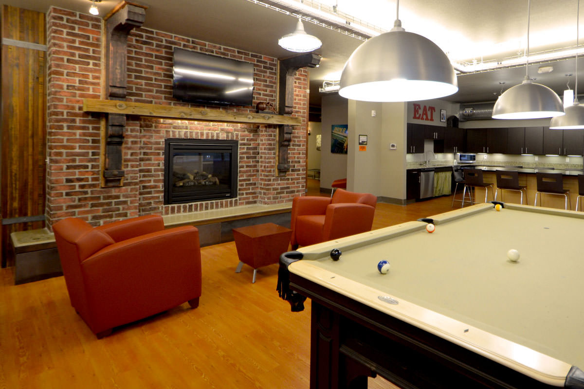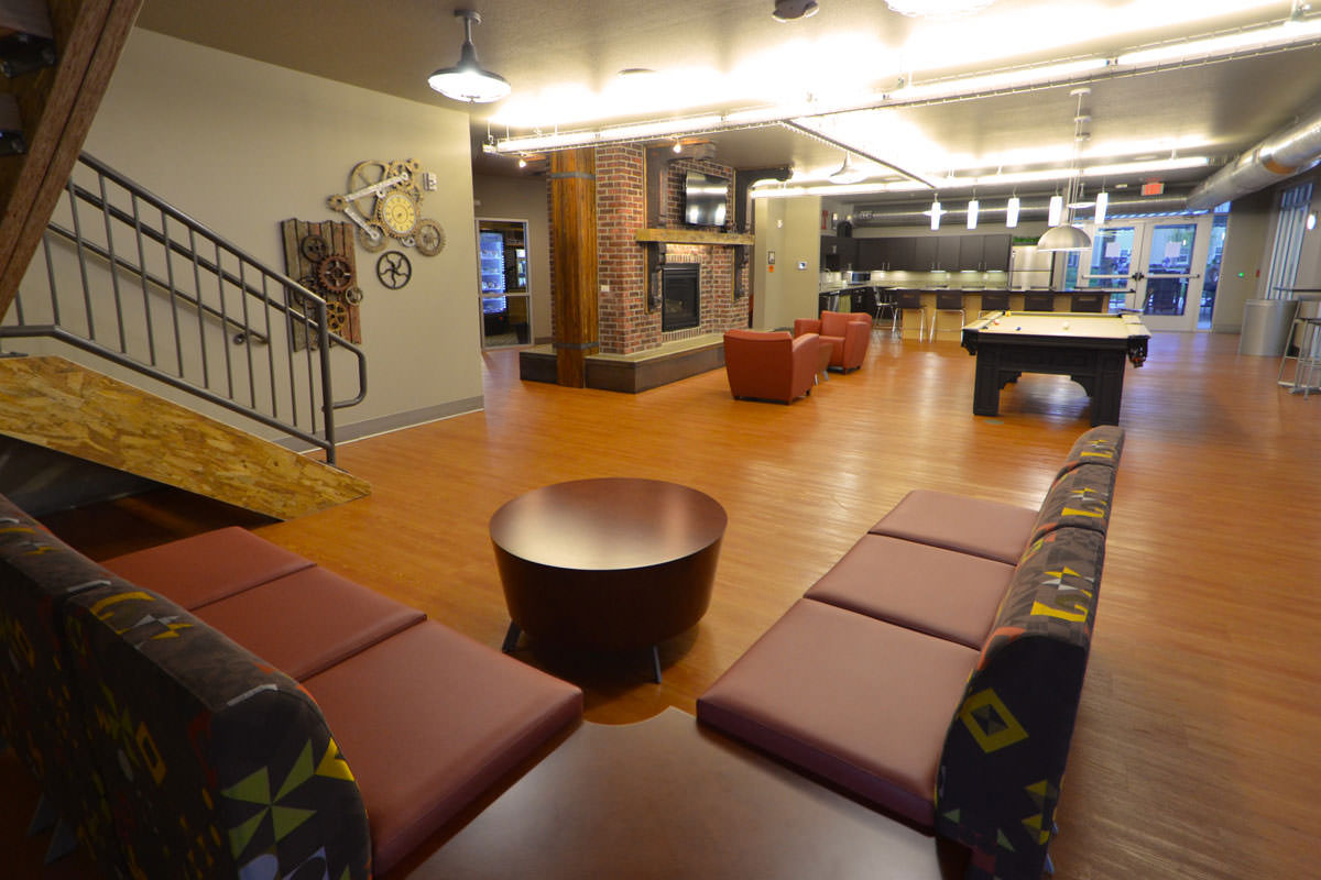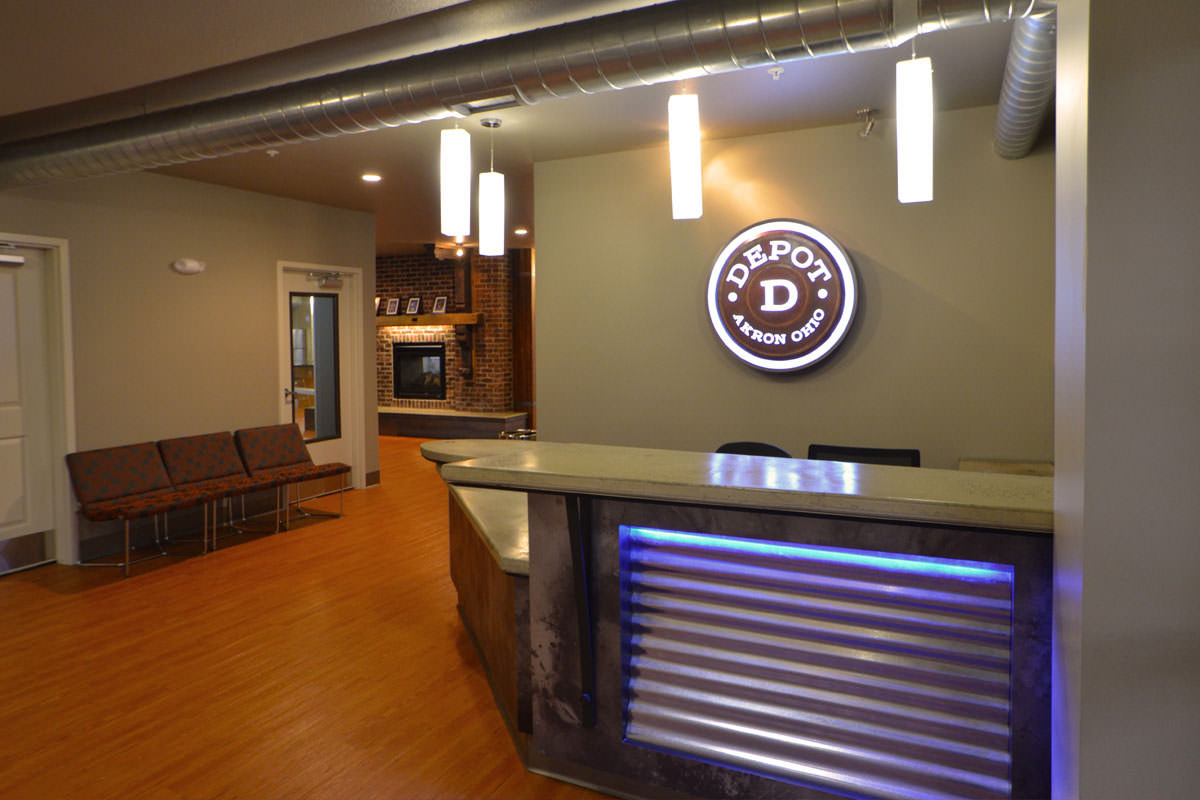 The Depot is Akron's 624-bed, four-story student housing community is on the former site of the Akron Beacon Journal newspaper sorting and storage facility. Historic brackets were saved from the turn of the century building and now frame the fireplace in the game room. The building is reminiscent of the industrial age with reclaimed wooden stairs, indirect lighting in metal raceways and exposed concrete.