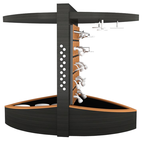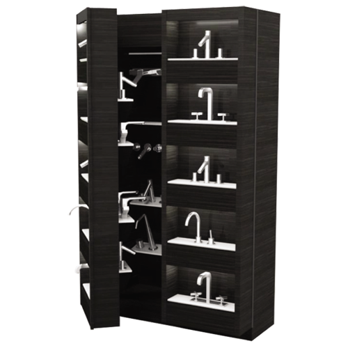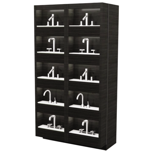 Inspired by a side-by-side refrigerator. The faucet display case reinforces your "Company Brand" and helps up-sale to higher priced faucets.