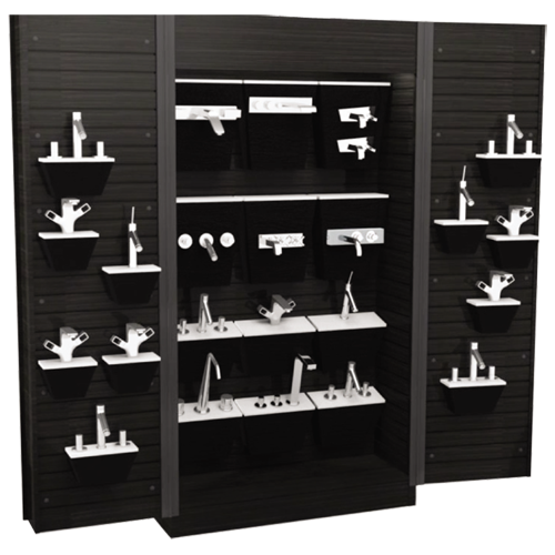 Open the doors to access lower price point faucets and the interior is configured to hold manufacturers stock faucet pallets utilizing slat wall brackets or add our faucet pallets for a consistent look.