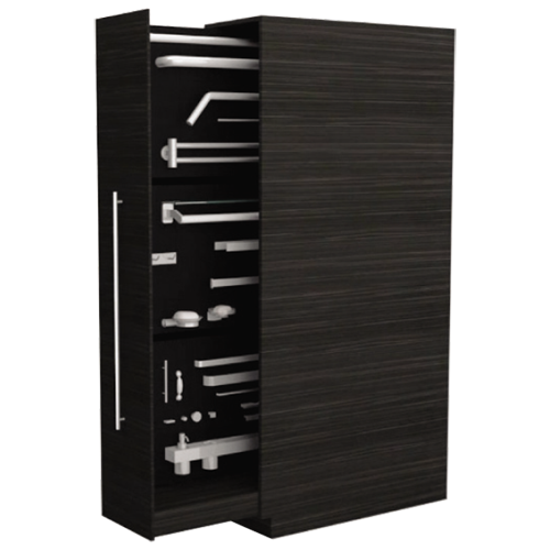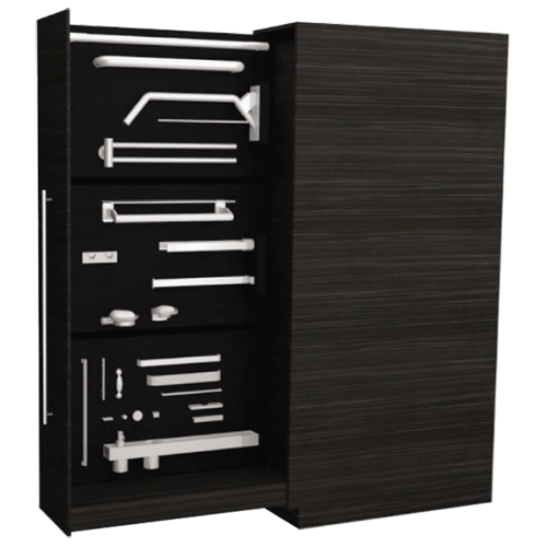 The larger pullout cabinet is designed for bathroom accessories such as towel bars, paper holders, soap dispensers, etc.