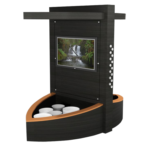 This versatile display can be stationary, with a water source hookup and drain, or moveable and self-contained, with a recirculating pump.